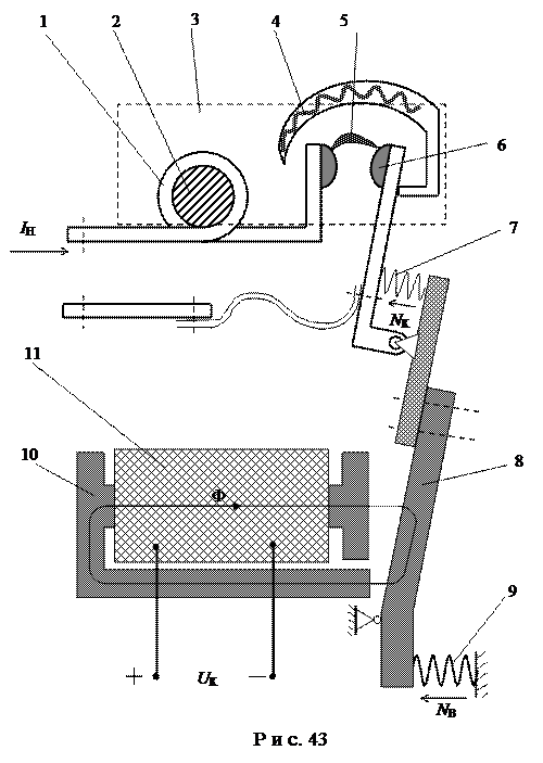 Конструктивная схема контактора постоянного тока клапанного типа с одним рабочим зазором приведена на рис. 43. Напряжение на катушке 11 отсутствует, произведено отключение, подвижная часть контактора под действием силы N В возвратной пружины 9 находится в крайнем правом положении.