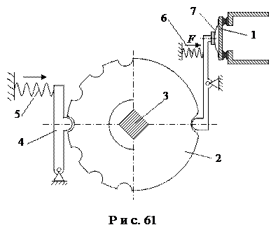 В кулачковых контроллерах вращаются кулачковые шайбы, которые воздействуют на рычаги подвижных контактов. На рис. 61 приведена упрощенная конструктивная схема нерегулируемого кулачкового командоконтроллера. Моменты замыкания и размыкания мостиковых контактов 1 зависят от профиля кулачковой шайбы 2. Положение вала 3 фиксируется с помощью рычажного фиксатора 4 с пружиной 5. Контакты прижимаются пружиной 6 и имеют контактную пружину 7. Кулачковых шайб на валу может быть несколько по количеству коммутируемых цепей.