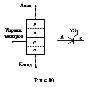 Управляемые полупроводниковые вентили – тиристоры представляют собой полупроводниковую структуру с тремя электронно–дырочными переходами p–n–p–n типа (рис.80).