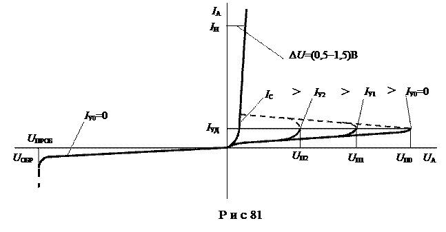 На рис. 81 приведена вольт–амперная характеристика тиристора, поясняющая принцип его работы.