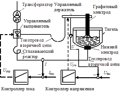Большие значения колебаний напряжения, создаваемых ДСП, работающих на переменном токе, привели к необходимости перевода этих печей на постоянный ток, к развитию плазменных и дуговых вакуумных печей. На рис. 3.6 показана схема питания дуговой печи постоянного тока с элементами управления. Управление процессом плавки производится автоматически с помощью контроллера тока и напряжения.