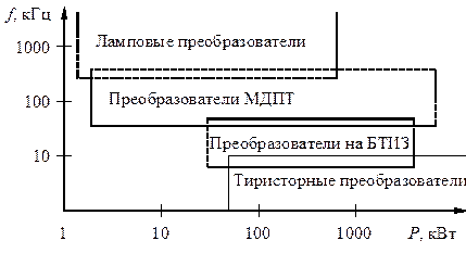 Тип полупроводникового прибора (тиристор, МДПТ или БТИЗ), схемное решение и принцип управления в значительной мере определяют достижимую частоту и КПД преобразователя частоты. Рис. 3.9 дает представление о частотах и мощностях, достигнутых в настоящее время при использовании различных установок.