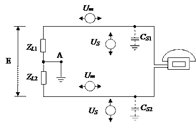 С целью безопасности и по практическим причинам телефонные цепи заземляют, а в эквивалентную схему включают входные сопротивления ZL 1 и ZL 2 по отношению к земле. Напряжение, наводимое электромагнитным путем, обозначают как источник напряжения Um, наводимое электростатическим путем, как US. Сопротивления ZL 1 и ZL 2 велики, поэтому собственным сопротивлением линии, имеющим много меньшее значение, можно пренебречь.