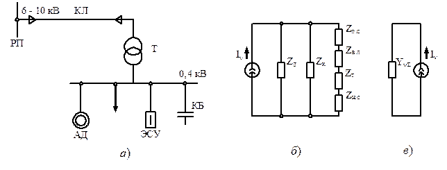Рис. 3.23. Схема электроснабжения (а) и схемы ее замещения (б, в)