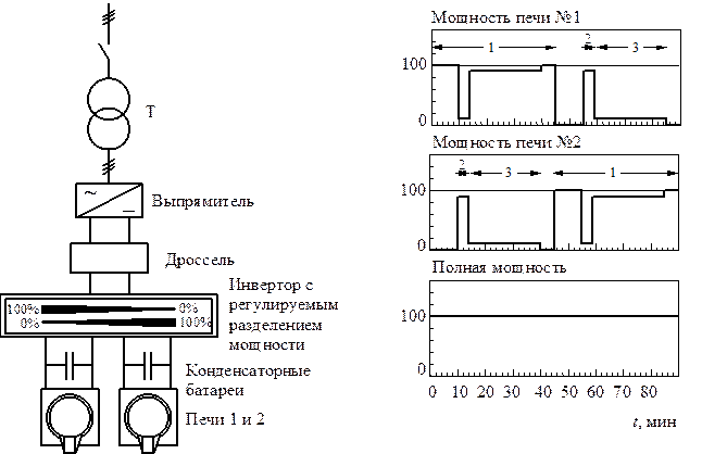Рис. 3.37. Схема двойного питания индукционных печей (а) и графики