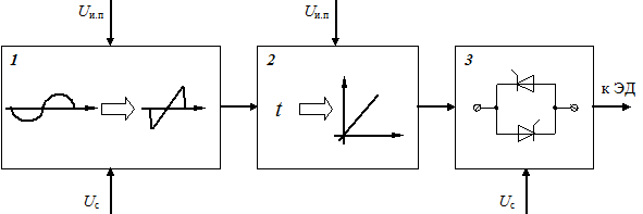 Устройство плавного пуска электродвигателя содержит три основных блока (рис. 3.38): 1 - блок преобразования синусоидальной формы напряжения сети в линейно меняющуюся (пилообразную) для реализации процесса плавного пуска; 2 - блок, реализующий закон изменения уровня напряжения во времени и обеспечивающий плавный пуск двигателя; 3 - блок силовых тиристоров, включенных непосредственно в цепь питания электродвигателя. Преобразование синусоидальной формы питающего напряжения в пилообразную блоком 1 позволяет уменьшить влияние искажений сетевого напряжения на погрешность угла управления тиристорами. Питание блоков 1 и 2 осуществляется от источника с ключевым режимом работы.