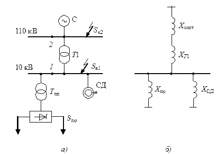 Рис. 4.1. Однолинейная схема (а) и схема замещения (б)