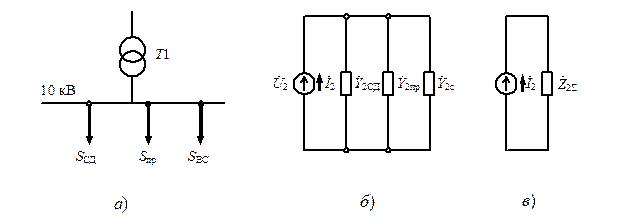 Рис. 4.2. Схема сети (а) и схемы замещения (б, в)