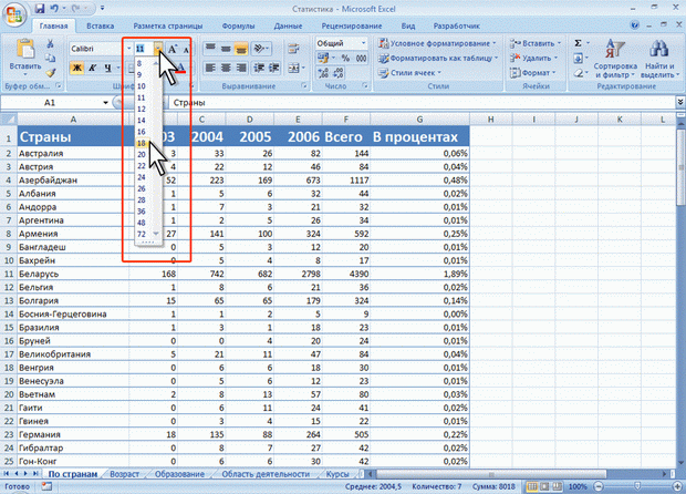 При использовании раскрывающегося списка надо щелкнуть по стрелке списка и выбрать требуемый параметр. Например, в раскрывающемся списке Размер шрифта группы Шрифт вкладки Главная можно выбрать размер шрифта (рис. 1.11).