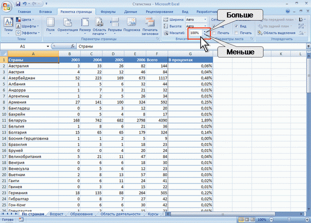 Счетчики используют для установки числовых значений каких-либо параметров. Для изменения значения пользуются кнопками счетчика Больше (Вверх) и Меньше (Вниз). Например, в счетчике Масштаб группы Вписать вкладки Разметка страницы можно установить величину масштаба печати документа (рис. 1.12).