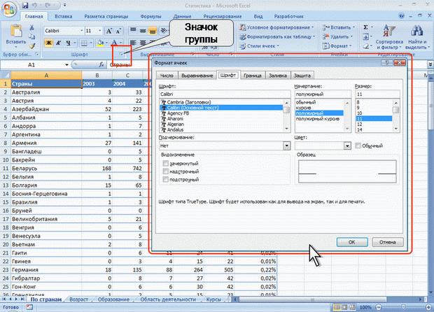 Значок (кнопка) группы – маленький квадрат в правом нижнем углу группы элементов во вкладке. Щелчок по значку открывает соответствующее этой группе диалоговое окно или область задач для расширения функциональных возможностей. Например, значок группы Шрифт вкладки Главная открывает диалоговое окно Формат ячейки (рис. 1.14).