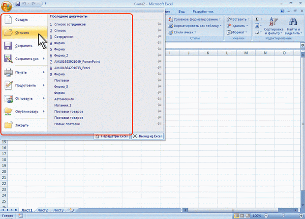 - Нажмите кнопку Office и выберите команду Открыть (рис. 2.9).