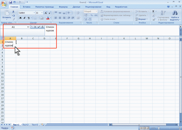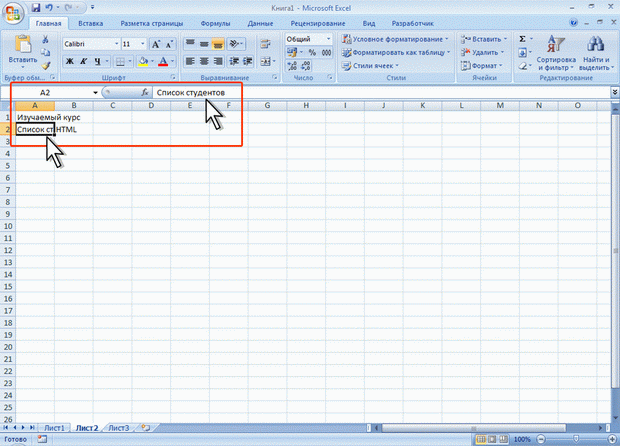 Данные можно вводить непосредственно в ячейку или в строку формул.