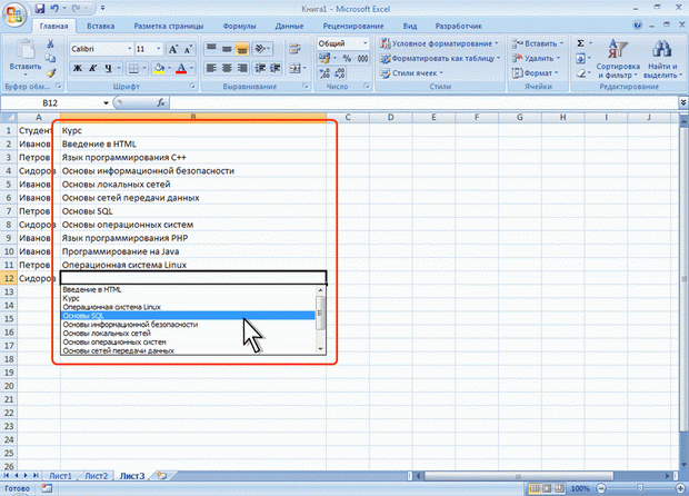 Следует отметить, что и автозавершение и выбор из списка эффективно работают только при условии, что данные в ячейках столбца составляют непрерывный ряд, а заполняемая ячейка находится непосредственно под ними. Если в ряде данных есть пустые ячейки, то будут использоваться только записи, расположенные ниже последней пустой ячейки.