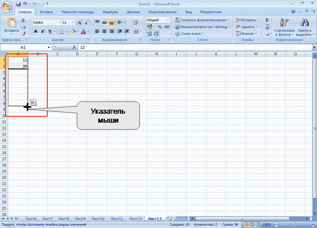 - Наведите указатель мыши на маркер автозаполнения (маленький черный квадрат в правом нижнем углу выделенной ячейки). Указатель мыши при наведении на маркер принимает вид черного креста.