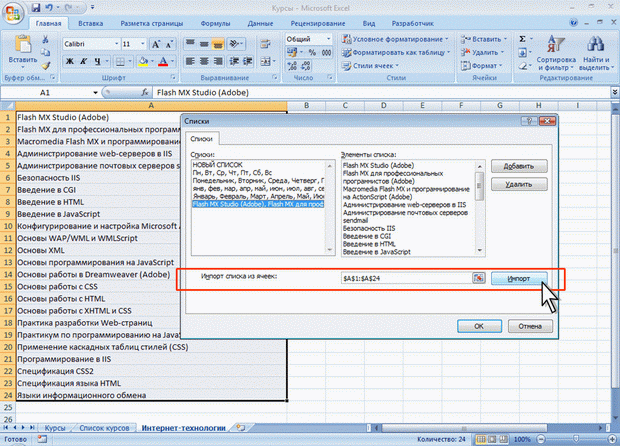 - В окне Списки убедитесь, что ссылка на ячейки в выделенном списке элементов отображается в поле Импорт списка из ячеек, и нажмите кнопку Импорт (рис. 4.15). Элементы выделенного списка будут добавлены в поле Списки, а его элементы будут отображаться в поле Элементы списка.