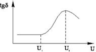 Начиная с напряжения U1 рост обусловлен ионизацией газовых включений в диэлектрике, при этом происходит увеличение выделения тепла, увеличение активной составляющей сквозного тока и соответственно увеличение тангенса угла диэлектрических потерь. После того, как произойдет пробой всех газовых включений уменьшится активная составляющая сквозного тока и соответствен- но снижение значения tgd.
