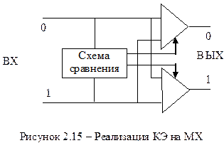 Задача КЭ отправить пакет, поступающий на любой вход в одно из двух направлений. Для 2х2 адрес имеет 1 бит 0 или 1 и, в соответствии с этим, пакет отправляется в 0 и 1 выходы. В зависимости от места КЭ в схеме, анализируются (используются) разные разряды адреса в пакете. Если КЭ имеет большие параметры, например 4х4, то используется большее число разрядов.