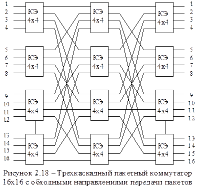 Если КЭ большей емкости чем 2х2, то в пакетном коммутаторе есть несколько путей, поэтому отпадает необходимость в сортировке. К примеру, КЭ 4х4. Строятся многокаскадные коммутаторы рис. 2.18.