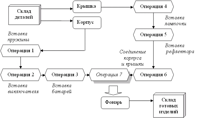 Процесс сборки изделия «Фонарь» реализуется по схеме, приведенной на рис. 3.7. Как видно из приведенной схемы, разработавший ее инженер-технолог в целях экономии производственного времени разбил всю последовательность на две части, выполняемые одновременно. Один поток собирает корпус, а второй – крышку фонаря. Каждый поток имеет несколько операций. Окончательная операция (№ 7) – сборка корпуса и крышки фонаря на рис. 3.7 выделена.