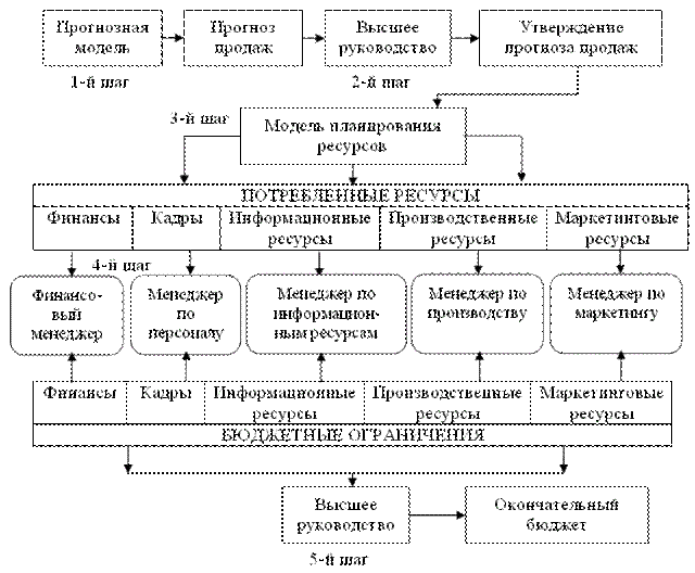 4-й шаг. Результаты, полученные от модели определения потребных ресурсов, оцениваются менеджерами каждой из функциональных сфер деятельности фирмы. Используя весь свой опыт, менеджеры всех уровней каждой из функциональных сфер стремятся так уточнить полученные ими данные, чтобы, с одной стороны, гарантировать безусловное выполнение запланированных работ, а с другой – уложиться в бюджетные ограничения. При необходимости процесс увязки может выйти на уровень высшего руководства.