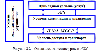 Основные логические уровни NGN (прикладной, уровень коммутации и управления, транспортный и доступа уровень) приведены на рис. 8.2.