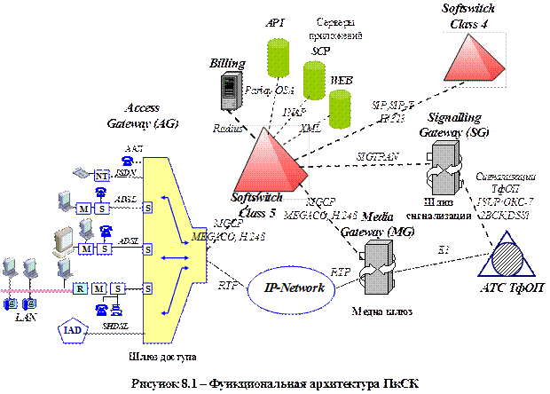 Ø шлюзов доступа AG (Access Gateway) — обеспечивает непосредственное подключение пользователей по различным технологиям (аналоговые и цифровые телефонные АЛ, линии xDSL, устройства интегрированного доступа IAD и.т.д.) к мультисервисной IP -сети;