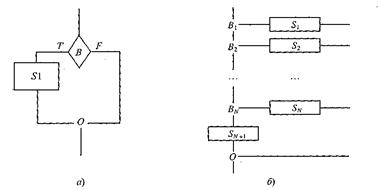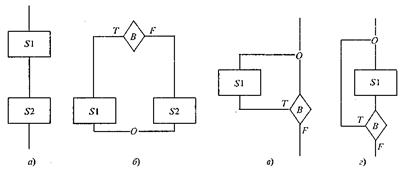 На рис. 2 изображены следующие блок-схемы: а - композиция, или следование; б - альтернатива, или развилка, в и г - блок-схемы, каждую из которых называют итерацией, или циклом (с предусловием (в), с постусловием (г)). S1 и s2 представляют собой в общем случае некоторые серии команд для соответствующего исполнителя, б — это условие, в зависимости от истинности (т) или ложности (f) которого управление передаётся по одной из двух ветвей. Можно доказать, что для составления любого алгоритма достаточно представленных выше четырех блок-схем, если пользоваться их последовательностями и/или суперпозициями. Блок-схема «альтернатива» может иметь и сокращенную форму, в которой отсутствует ветвь s2 (рис.3, а). Развитием блок-схемы типа альтернатива является блок-схема «выбор» (рис.3, б).