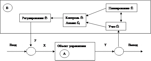 Процесс управления включает пять основных функций (рис. 3): планирование (f1); учет (f2); контроль (f3); анализ (f4); регулирование (f5).