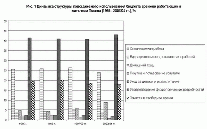 Регулярные исследования бюджета времени (осуществлявшиеся органами госстатистики до 1990-х гг.), сейчас, к сожалению, практически не осуществляются. Получить представление о динамике временных затрат горожан можно лишь, основываясь на результатах исследований социологов РАН, исследовавших эту проблему на примере Пскова в 1986 г., 1997/1998 гг. и 2003/2004 гг.1 Данный город в сравнительном международном проекте 1965 г. был избран в качестве среднего по всем характеристикам объекта. Понятно, что эта изучавшаяся учеными «выборка» с 1986 г. по 2004 г. «постарела», однако, такая же тенденция характерна для России в целом (по данным переписи населения 2002 г. средний возраст жителей страны увеличился на три года и составил 37,7 года)2. Похожие данные наблюдаются и в вопросе занятости населения.