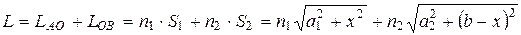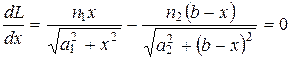 Для нахождения минимального оптического пути продифференцируем L по х и приравняем производную к нулю.