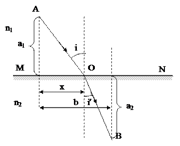Найдем положение точки О, в которой луч должен преломится при распространении из т А. в т. В.