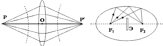 Для эллипсоида все лучи, выходящие из фокуса F1 и проходящие после отражения в фокус F2 являютсятаутохронны-ми, то есть требуют одинаковое время прохо-ждения.