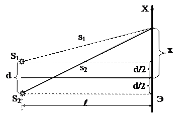 Найдем ширину интерференционных полос от двух когерентных источников S 1 и S2, находящихся на расстоянии d от двух цилиндрических волн, будут наблюдаться свет и темные полосы. Источники колеблются в одинаковой фазе.
