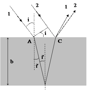 Лучи 1 и 2 в точке С интерферируют. Их разность хода от момента падения луча 2 на верхнюю поверхность до его распространения в точку С равна