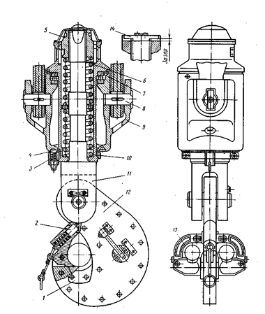 12 – центральный крюк; 13 – боковые рога; 14 – стопорная планка