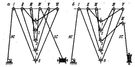 1, 2, 3, 4, 5 - шкивы талевого блока, I, II, III, IV, V, VI – шкивы кронблока.
