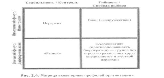Наконец, четвертый вариант, хотя также исходит из необходимости поддержания стабильности, ориентируется прежде всего на внешнюю среду. Его приоритеты — производительность, конечные результаты и их последовательное улучшение. Такого рода организации прозрачны для своих клиентов и всегда готовы вступить с ними в контакт. Поэтому их культура именуется «рыночной».