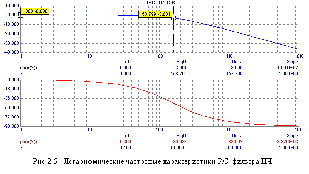 На рис.2.7. Показаны частотные характеристики фильтра ВЧ (R = 1 кОм, и С = 1 мкФ) в логарифмическом масштабе.