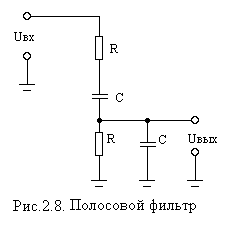 Полосовой фильтр. Соединяя последовательно фильтр верхних и низких частот с перекрывающимися амплитудно-частотными характеристиками можно получить полосовой фильтр. Полосовой фильтр пропускает сигнал в некоторой полосе частот и подавляет сигнал на низких и высоких частотах. На рис 8. показана схема полосового фильтра.