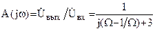 Коэффициент максимальный при Ω = 1. Следовательно, резонансная частота f0 = 1/ 2πRC. Коэффициент усиления на резонансной частоте равен A(f0) = 1/3, а фазовый сдвиг равен 0.