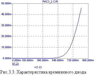 Диод как нелинейный элемент описывается вольтамперной характеристикой (в.а.х.) I(UAK). На рис.3.3 показана прямая ветвь в.а.х. кремниевого диода, полученная в системе моделирования MicroCAP. Прямой ток резко возрастает при достижении некоторого малого положительного напряжения UAK. Однако он не должен превышать некоторого определенного максимального значения Iмакс, так как иначе произойдет перегрев, и диод выйдет из строя. Из характеристики видно, что диод открывается не сразу, когда напряжение UAK становится больше нуля, а при достижении некоторого напряжения UD. Для германиевых диодов UD находится в пределах от 0,2 до 0,4 В, для кремниевых – от 0,5 до 0,8 В. Приближенно ход характеристики может быть описан значениями прямого напряжения UD при токах порядка 0,1Iмакс.