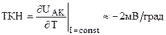 ТКН означает, что один и тот же ток диода достигается при напряжении UАК меньшем на 2 мВ при увеличении температуры на 1 градус. Пропорциональное уменьшение прямого напряжения с температурой при постоянной величине тока означает, что с увеличением температуры ток возрастает по экспоненциальному закону, если постоянное напряжение постоянно.