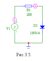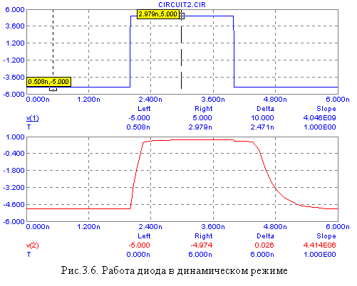 Рассмотрим работу диода в динамическом режиме. Схема, с помощью которой можно исследовать переключения диода из проводящего состояния в закрытое, представлена на рис.3.5. Источник импульсного напряжения вырабатывает разно полярные импульсы амплитудой 5 В. Резистор R1 ограничивает ток через диод. Процесс переключения диода из одного состояние в другое наблюдаем по изменению напряжения на диоде. Графики напряжения генератора импульсов V1 и напряжения на диоде V(2), полученные в MicroCAP, показаны на рис.3.6. При отрицательном значении напряжения генератора диод закрыт, ток через него практически равен 0, падение напряжения на диоде 5 В. При изменении сигнала с генератора на положительное диод смещается в прямом направлении, через диод начинает протекать прямой ток. Однако прямое падение напряжения на диоде устанавливается не сразу, а через некоторое время. При этом происходит накопление носителей заряда в диоде. Величина накопленного заряда тем больше, чем больше прямой ток диода. При поступлении отрицательного импульса диод начинает закрываться не сразу, некоторое время поддерживается прямой ток. Этот ток обусловлен рассасыванием накопленных в диоде зарядов.