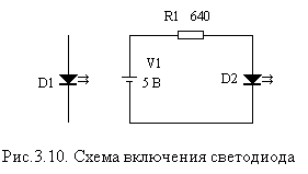 Светодиоды - это диоды, которые излучают свет при протекании через них прямого тока. Область спектрального излучения диодов имеет довольно узкие границы. Условное графическое изображение светодиодов и схема их включения показаны на рис.3.10.