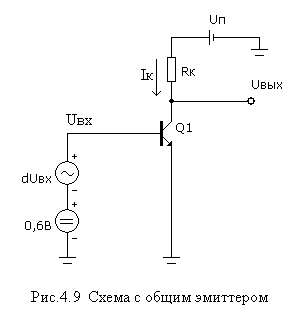 Для лучшего понимания работы транзистора рассмотрим схему транзистора с общим эмиттером, которая показана на рис 4.9. Подадим на вход схемы сначала постоянное напряжение величиной близкое к 0,6 В с тем, чтобы задать постоянный ток коллектора небольшой величины порядка единиц мА. Напряжение на выходе схемы будет равно