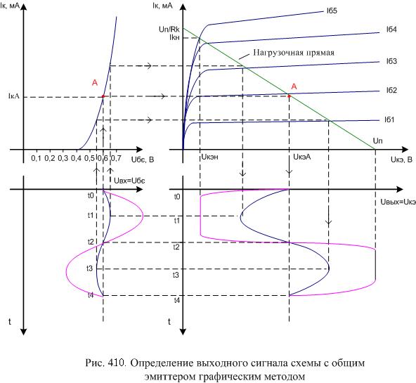 Более наглядно процесс прохождения сигнала в схеме можно рассмотреть с помощью графо-аналитического метода. Задача состоит в следующем: необходимо построить график выходного сигнала, если известен входной сигнал. Построение выходного сигнала графоаналитическим методом показано на рис.4.10. В верхней части рисунка представлены передаточная и выходные характеристики транзистора, построенные в одном масштабе по току коллектора. В нижнем левом углу показан график входного сигнала, представляющий собой сумму постоянного напряжения величиной 0,6 В, задающего рабочую точку транзистора и полезный синусоидальный сигнал, который изменяется относительно постоянной составляющей (синяя линия). Постоянный сигнал определяет положение рабочей точки на передаточной характеристике транзистора – точка А.