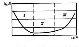 С увеличением длины дуги ее напряжение возрастает и кривая статической вольтамперной характеристики поднимается выше, с уменьшением длины дуги опускается ниже, качественно сохраняя при этом свою форму. Кривую статической характеристики можно разделить на три области: падающую, жесткую и возрастающую. В первой области увеличение тока приводит к резкому падению напряжения дуги.