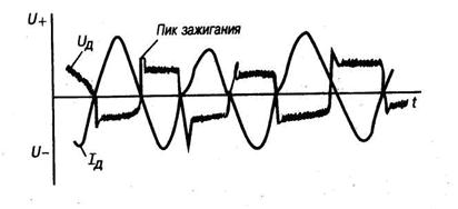 Одновременно изменяется и направление движения заряженных частиц в дуговом промежутке. В условиях пониженной температуры активных пятен и степени ионизации в дуговом промежутке повторное зажигание дуги в начале каждого полупериода происходит только при повышенном напряжении между электродами, именуемым пиком зажигания или напряжением повторного зажигания дуги. Пик зажигания всегда выше напряжения дуги, соответствующего стабильному режиму ее горения. При этом величина пика зажигания несколько выше в тех случаях, когда катодное пятно находится на основном металле. Величина пика зажигания существенно влияет на устойчивость горения дуги переменного тока. Деионизация и охлаждение дугового промежутка возрастают с увеличением длины дуги, что приводит к необходимости дополнительного повышения пика зажигания и влечет снижение устойчивости дуги. Поэтому затухание и обрыв дуги переменного тока при прочих равных условиях всегда происходят при меньшей ее длине, чем для постоянного тока. При наличии в дуговом промежутке паров легко-ионизующихся элементов пик зажигания уменьшается и устойчивость горения дуга переменного тока повышается.