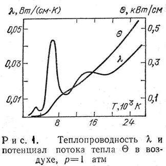 Учет всех этих процессов приводит к сложной зависимости теплопроводности плазмы λ(T) от температуры. На рис.1 представлена для иллюстрации типичная зависимость теплопроводности от температуры. Здесь же изображена функция Θ(Т). Видно, что за счет интегрирования эта функция существенно «глаже», чем функция теплопроводности. Ее приближенно можно аппроксимировать отрезком прямой линии.